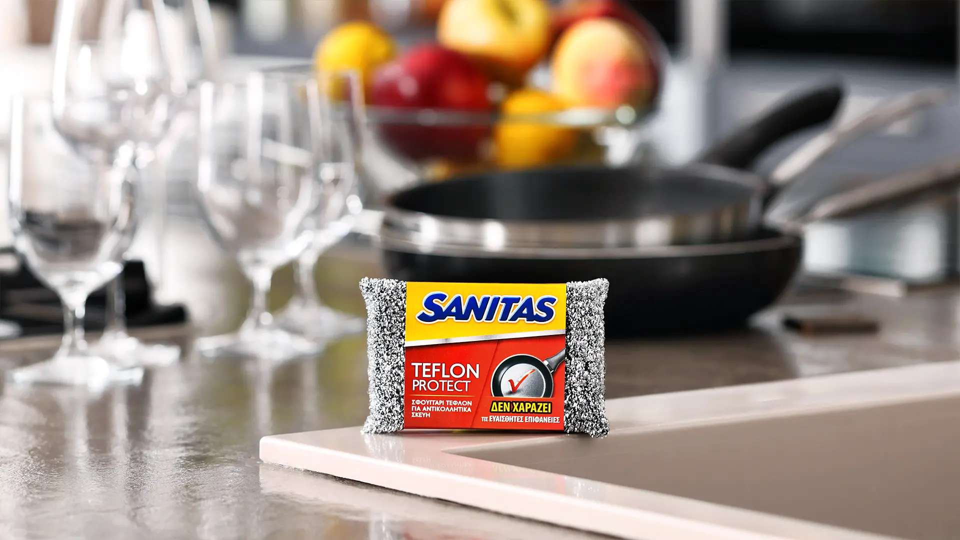 To σφουγγάρι για αντικολλητικά σκεύη Sanitas Teflon Protect είναι ιδανικό για το καθημερινό πλύσιμο όλων των αντικολλητικών σκευών (τηγάνια, κατσαρόλες, ταψιά). Χάρη στην καινοτόμα σύνθεσή του, καθαρίζει άψογα τις ευαίσθητες επιφάνειες χωρίς να χαράζει ενώ είναι ειδικά σχεδιασμένο για χρήση ακόμα και σε επιφάνειες όπως σκεύη από κρύσταλλο. Καθαρίζει εύκολα ενώ καθαρίζεται ακόμα ευκολότερα χωρίς να συγκρατεί κατάλοιπα τροφών και βρωμιάς.
